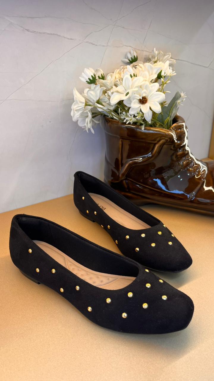 Sapatilha Feminina Sua Cia em Camurça Sintética com Tachas Douradas – Elegância, Conforto e Sofisticação Atemporal